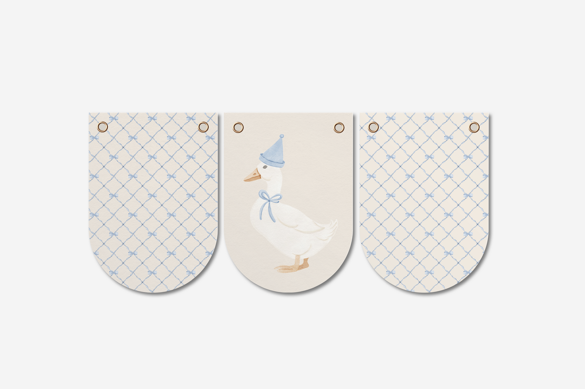 Bunting has gold metal rings (eyelets) around holes where ribbon is strung. The metal eyelets detail gives the bunting a more luxurious feel.